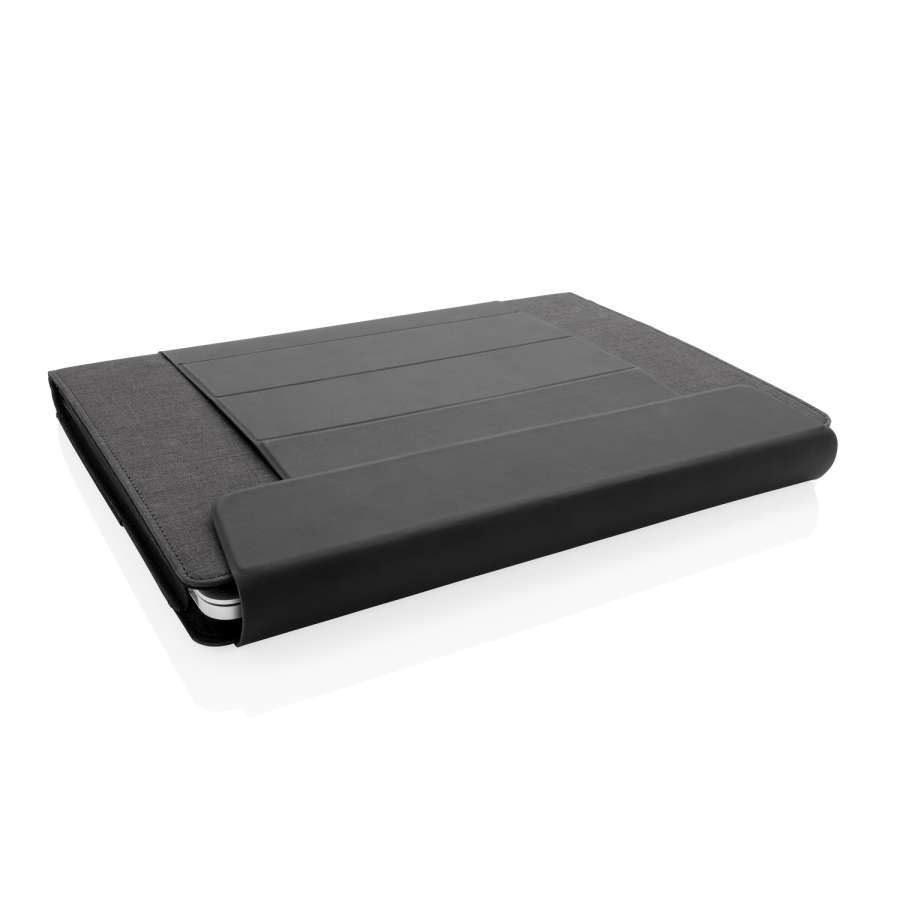 Создайте свой собственный офис, где бы вы ни находились, с этим практичным чехлом для ноутбука 2 в 1. Он легко трансформируется в подставку, чтобы вы могли комфортно работать. Оснащен дополнительными кармашками и держателями для ручек, поэтому у вас под рукой всегда будет то, что вам нужно. Современный дизайн выполнен с использованием RPET и PU. Подходит для ноутбуков диагональю 15, 4".