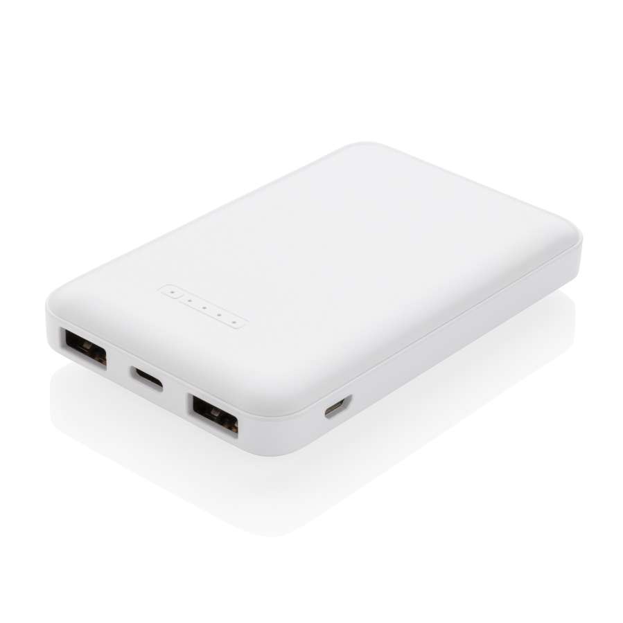 Сверхкомпактный внешний аккумулятор на 5000 мАч с функцией беспроводной зарядки 5 Вт сделан из легкого пластика ABS, поэтому его очень удобно брать с собой. Способен подзарядить ваш смартфон до 3 раз. Устройство оснащено долговечным литий-полимерным аккумулятором высокой плотности класса А на 5000 мАч. Два USB-порта. Благодаря индикаторам питания вы всегда будете знать, когда нужно подзарядить аккумулятор. Вход 5 В / 2 А. Выход USB 1: 5 В / 2 А. Выход USB 2: 5 В / 1 А. Беспроводной выход: 5 В / 1 А, 5 Вт.
