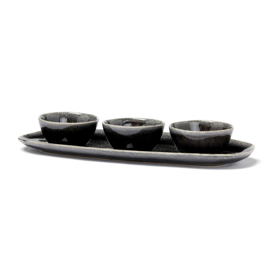 Подача соусов, небольших закусок, фруктов или овощей, суши — использовать этот сервировочный набор можно по-разному. В комплект входят три миски и блюдо — неровные края и уникальный окрас придают им особый шарм. Серия Nomimono — это уникальное сочетание Японии и Скандинавии, рустика и модерна. Вдохновленная природой коллекция выполнена в натуральных оттенках. Все изделия созданы вручную, благодаря чему каждый предмет получился неповторимым. Миски изготовлены из керамики с тройным глазурованием — это коллекционные вещи для вдохновляющей подачи, которые превратят любое застолье в настоящий праздник. В наборе — 4 предмета.