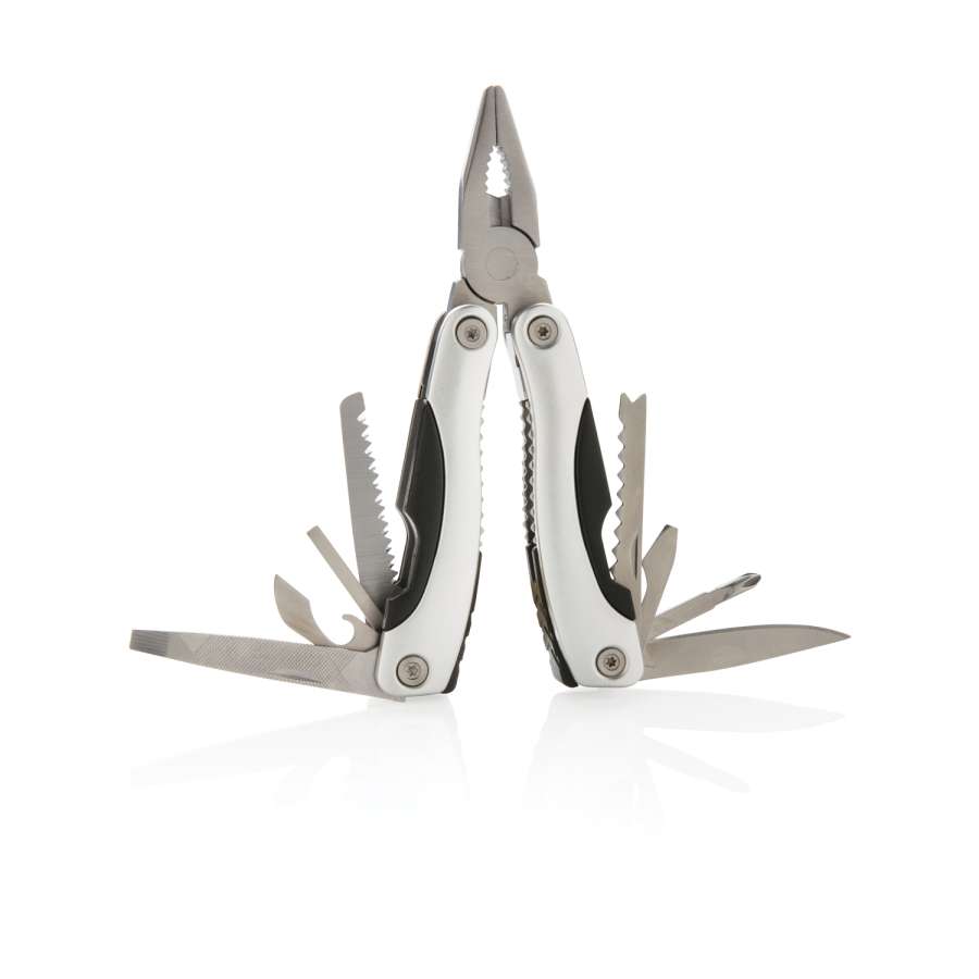 Это алюминиевый многофункциональный инструмент с ручками черного цвета совмещает в себе 14 функций. В комплект входит черный чехол 600D.
