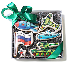 Печенье с логотипом. Как отдельные печеньки, так и наборы. Можно перевязать такие наборы ленточкой с логотипом или георгиевской ленточкой. Наборы могут быть составлены из традиционных мужских аксессуаров успеха (галстук, дом, кошелек), в виде пожеланий богатства (яхта, мешок денег) или воинственных комиксов.