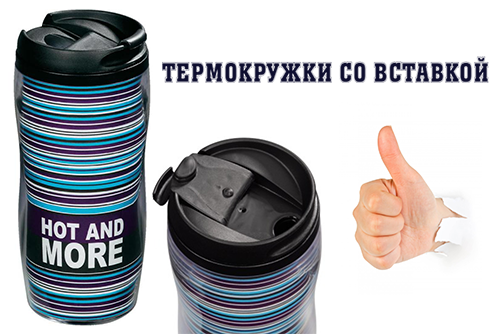 Термокружки с полиграфической (бумажной или пластиковой) вставкой - отличный вариант для подарка коллегам и эффективный рекламный ход! А если понадобится, вставку легко заменить. Срок поставки 2-3 недели, доставка в пределах МКАД и макет бесплатно.