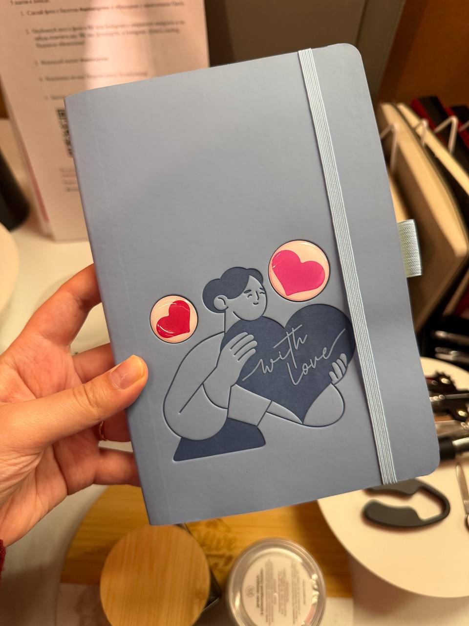 Мы сейчас активно экспериментируем с совмещением разных видов печати на одном изделии. И вот что получается: на блокнотах и ежедневниках мы предлагаем сочетать блинтовое тиснение с добавлением объемных стикеров!