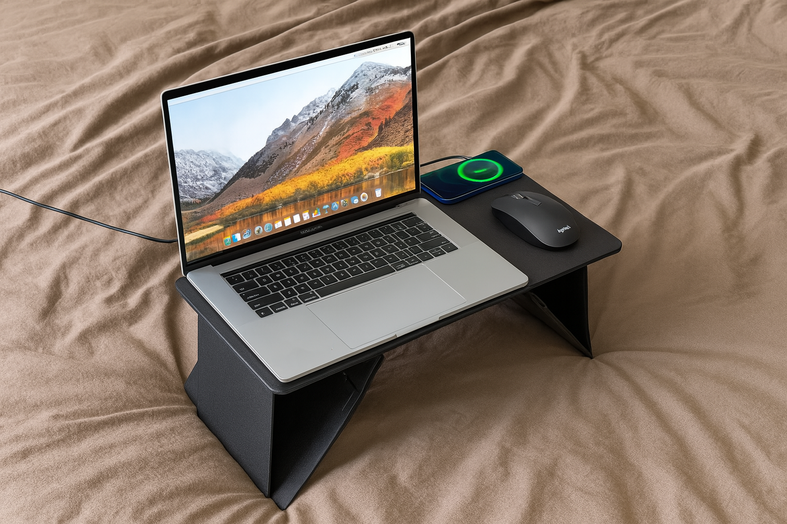 Удобство в деталях — именно так можно описать этот стол. Компактный, складной, с поверхностью для ноутбука или планшета и встроенной беспроводной зарядкой для смартфона.